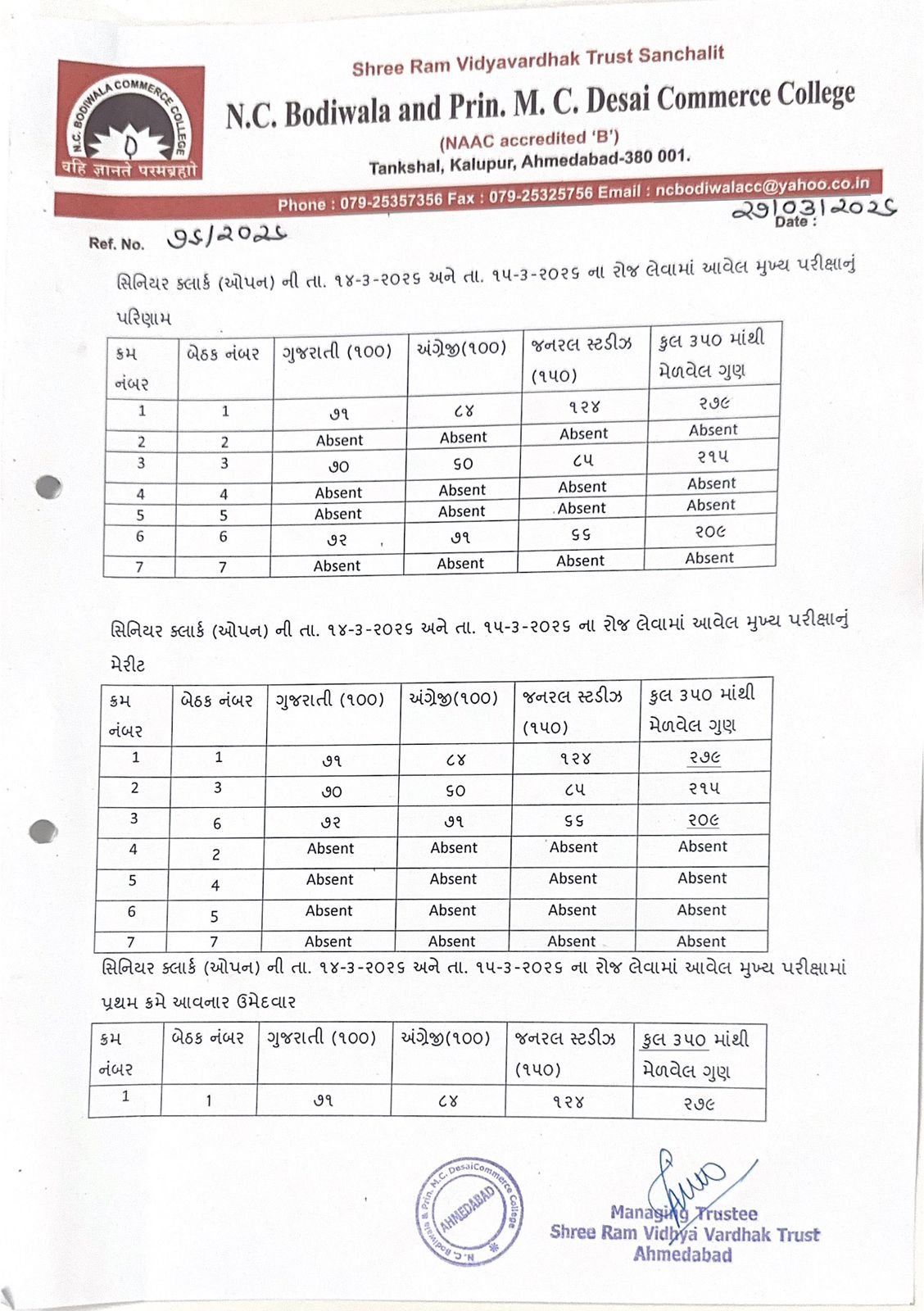Applications are invited for the posts of Junior Clerk at N.C. Bodiwala and Prin. M.C. Desai Commerce College, Managed by Shree Ram Vidyavardhak Trust, Ahmedabad. Applications along with necessary documents should reach the Principal by Speed Post within ten days of this notice.
